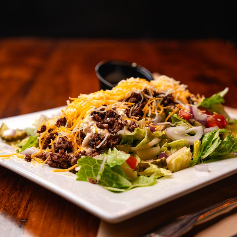 Romaine lettuce blend tossed in Pearl's special sauce, 8oz burger with melted cheddar, tomatoes, chopped dill pickles, diced red onion, cheddar jack, and sesame seeds.