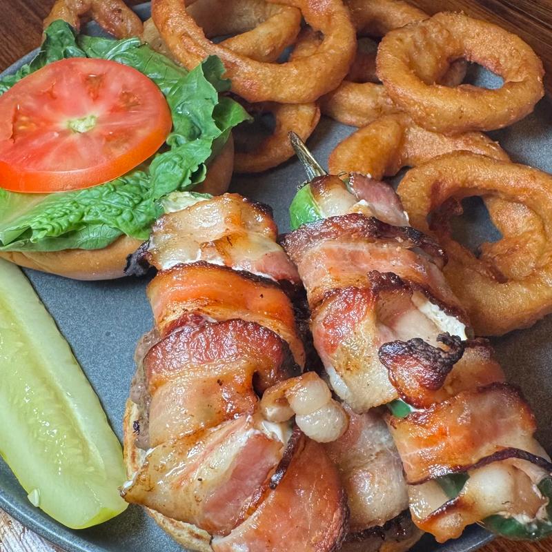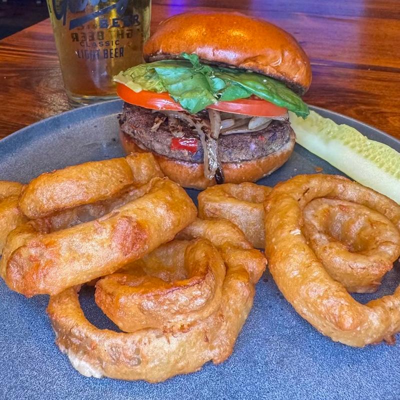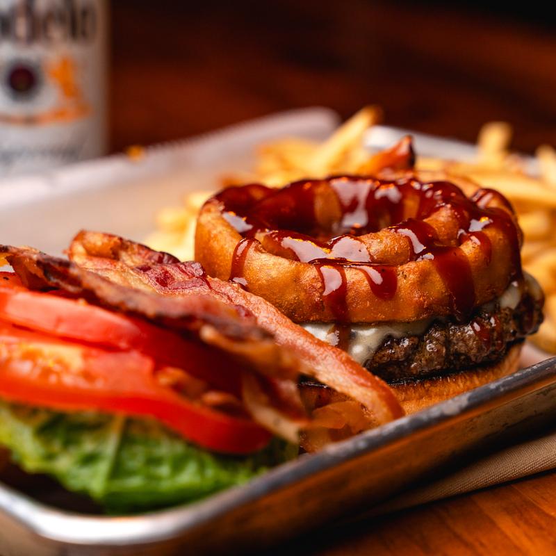 8 oz Piedmontese ground beef burger with onion rings, bacon, pepper jack cheese, lettuce, tomato, and BBQ sauce.