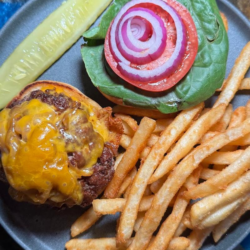 8 oz Piedmontese ground beef smashed on the flat top with grilled onions and cheddar cheese.