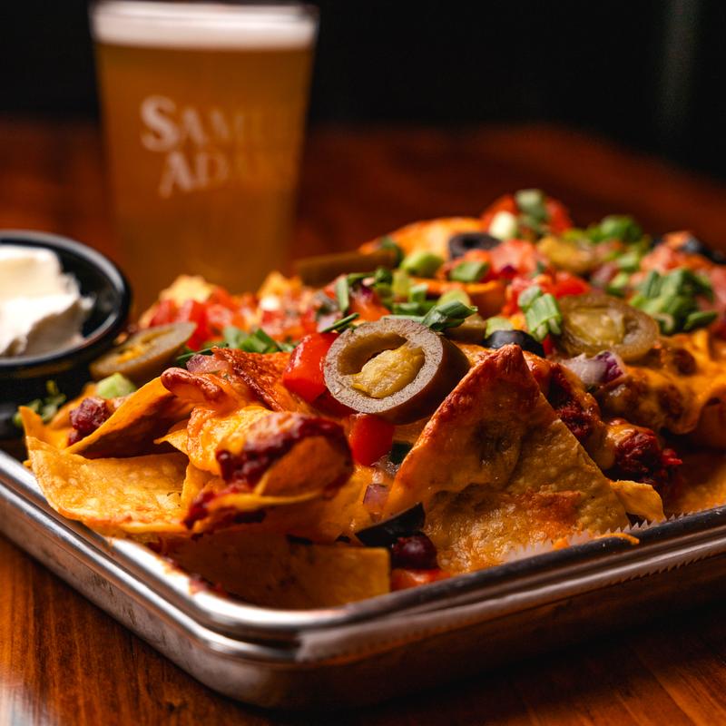 Homemade tortilla chips topped with chili, housemade queso sauce, jalapenos, and pico de gallo.