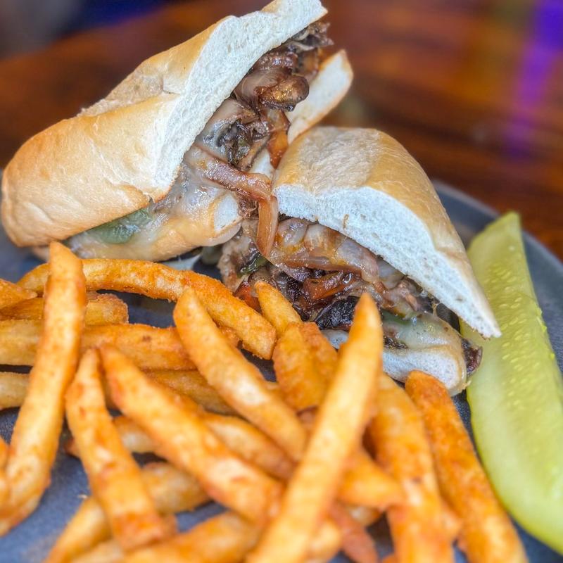 Shaved sirloin steak with chopped peppers, onions, mushrooms, and white cheddar cheese.