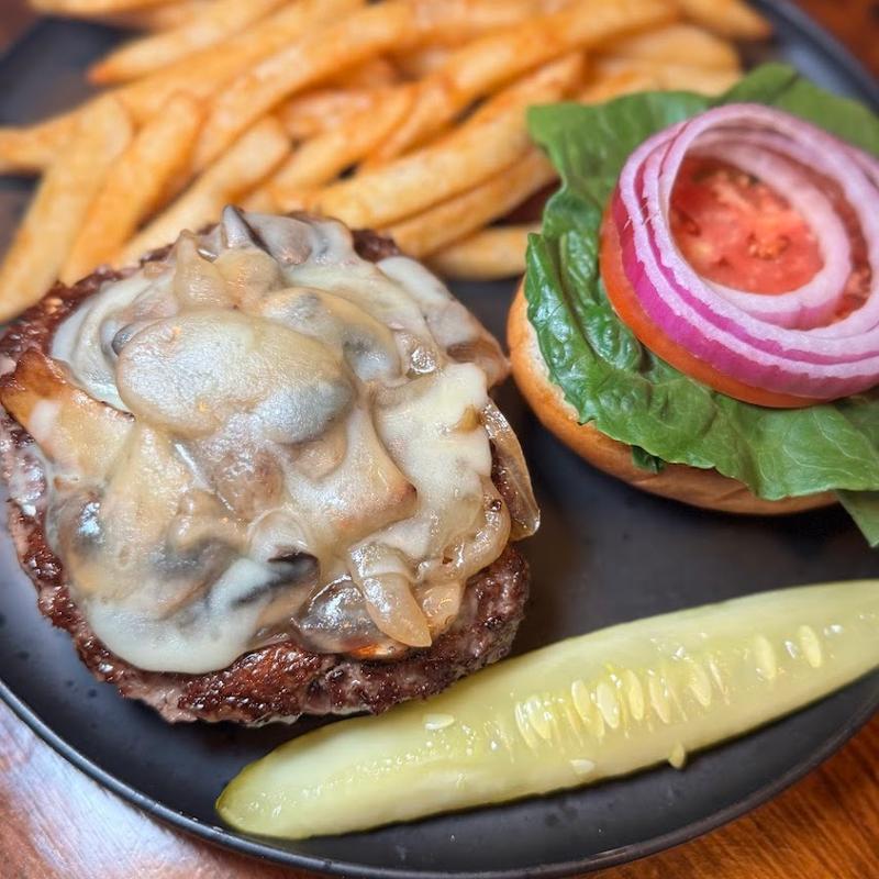 8 oz Piedmontese ground beef burger topped with sauted mushrooms and onions, topped with Swiss cheese.