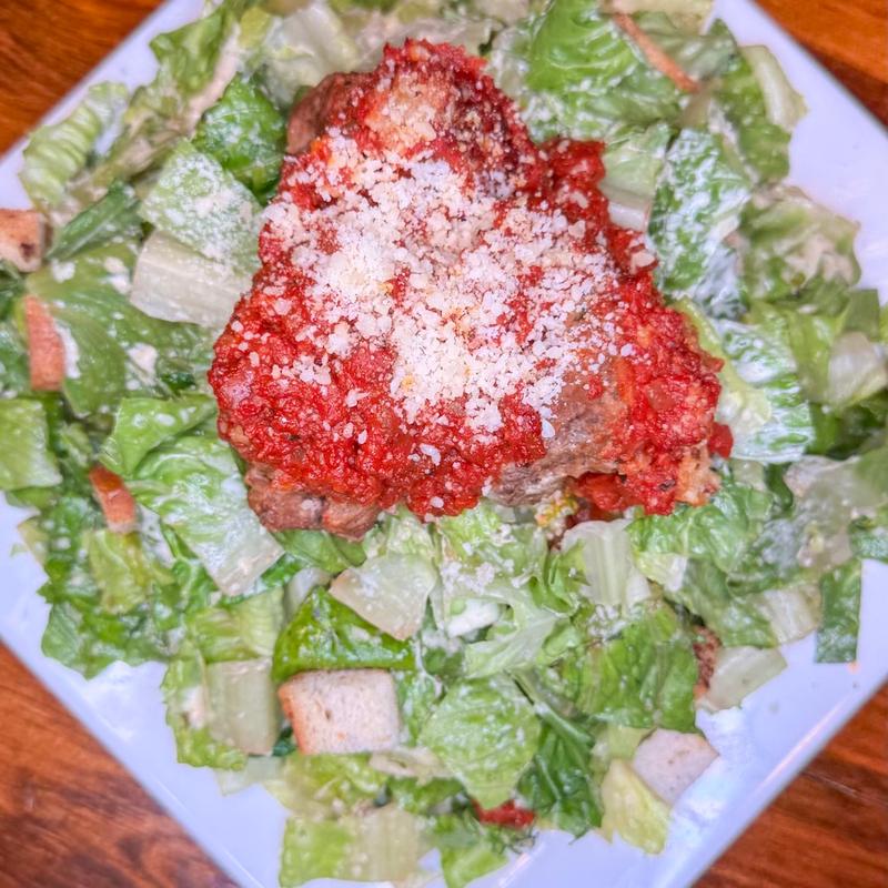 Fresh romaine lettuce tossed in our caesar dressing with two meatballs on top with a little extra marinara sauce.