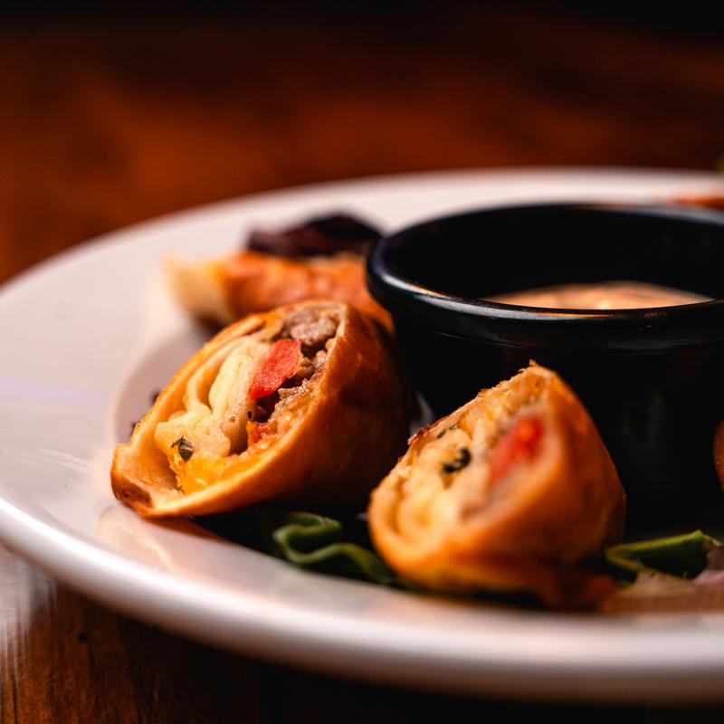 Two fried mini burritos stuffed with ground beef, cheese, and pico de gallo.