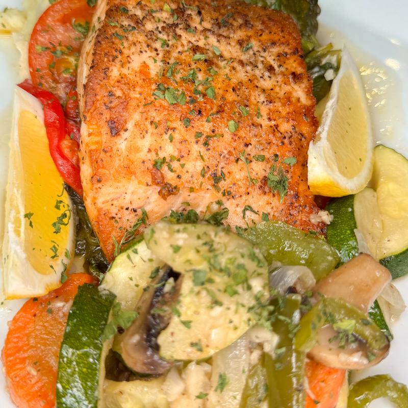 Salmon filet seared to perfection over a bed of sauteed spinach and fresh sliced tomato.