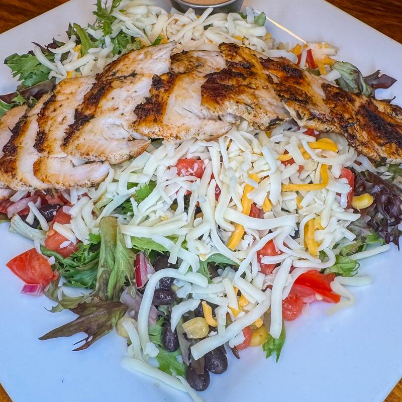 Blend of romaine and spring mix with chopped tomato, onion, pico, pickled jalapeno, blended cheese, corn and beans with a side of chipotle ranch. Choice of ground beef or blackened chicken.