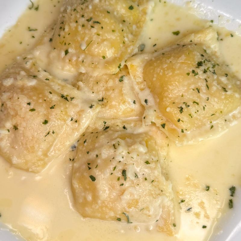 Roasted chicken and garlic filled ravioli in a garlic cream sauce.