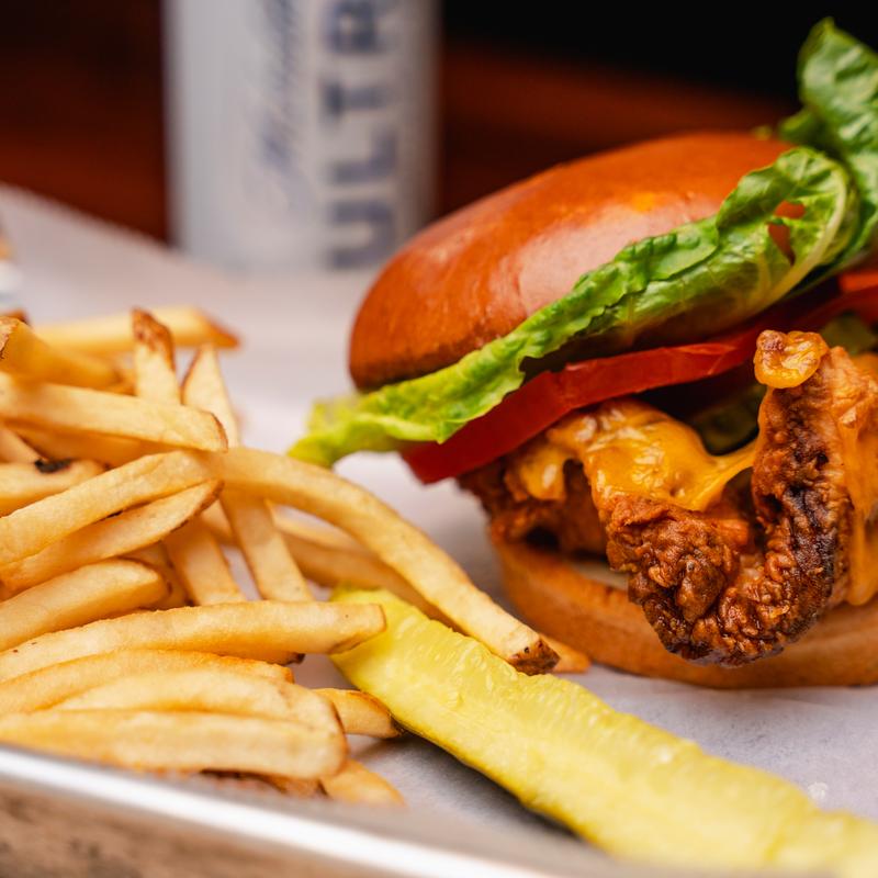 Fried chicken sandwich with lettuce, tomato, pickles and cheese.