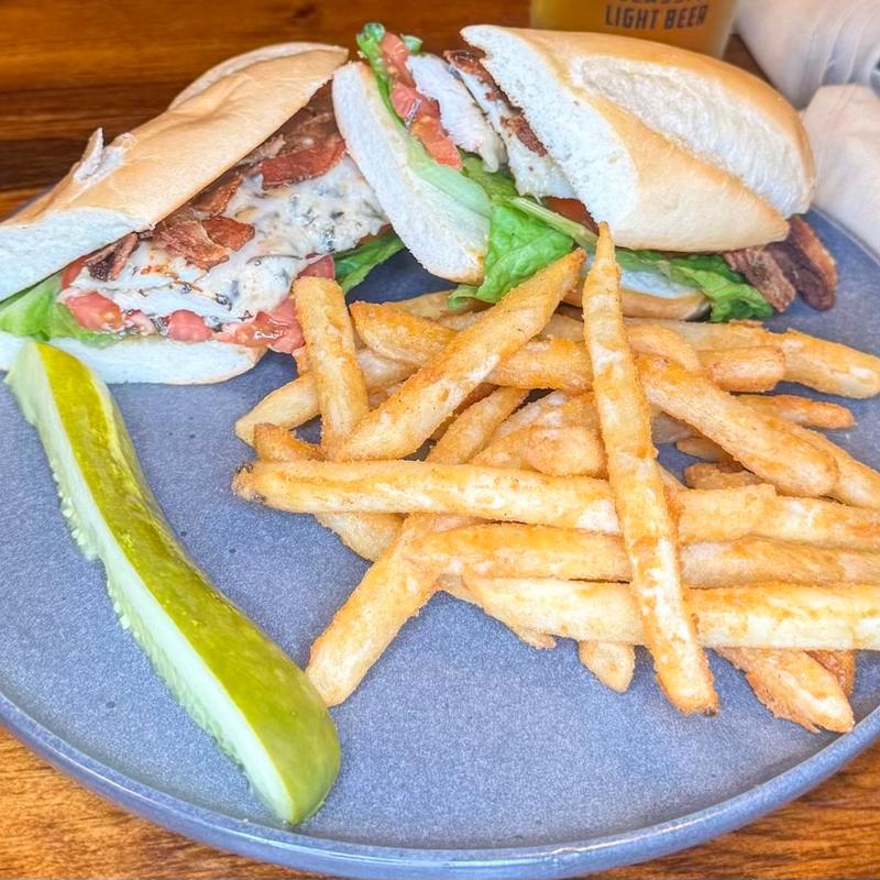 Grilled chicken breast, bacon, lettuce, tomato and pickles with ranch dressing.