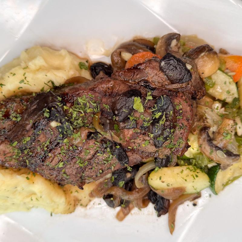 12 oz Piedmontese New Your strip broiled to perfection and topped with our house made steak sauce.