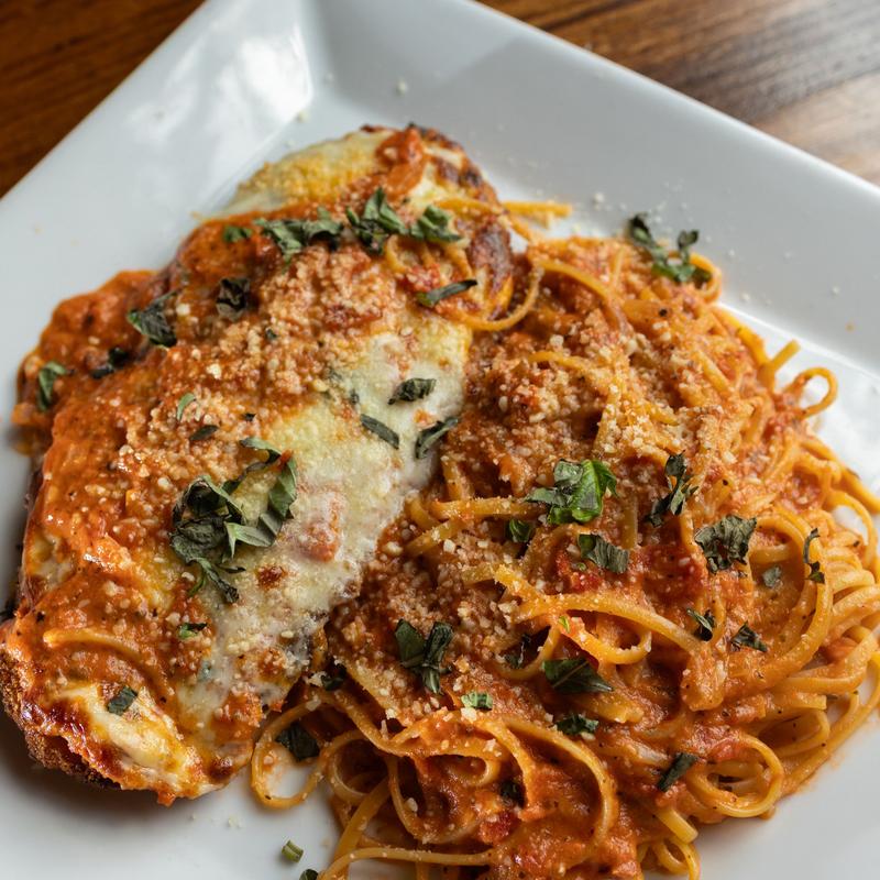 Golden brown chicken cutlet served with vodka sauce over linguini pasta, topped with mozzarella, and parmigiano cheese.