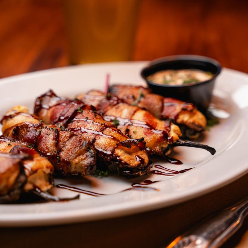 Six fresh jalapenos stuffed with cream cheese and wrapped in bacon.