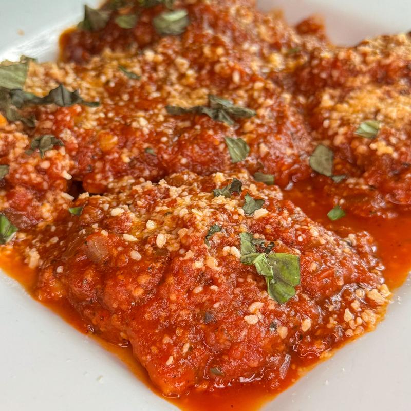 Beef and ricotta ravioil in our signature meat sauce topped with fresh basil.