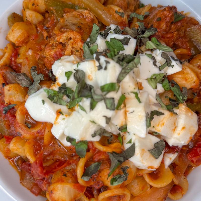 Orecchiette pasta sauteed with Italian style hot/sweet sausage, EVOO, sliced garlic, peppers and onions in our blended fresh Pomodoro vodka sauce topped with fresh mozzarell cheese.