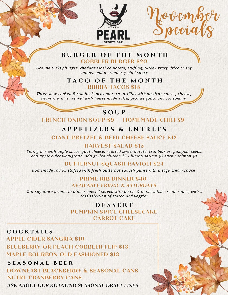 Welcome! Please join us this month to savor our November food and drink Specials. We look forward to hosting you.